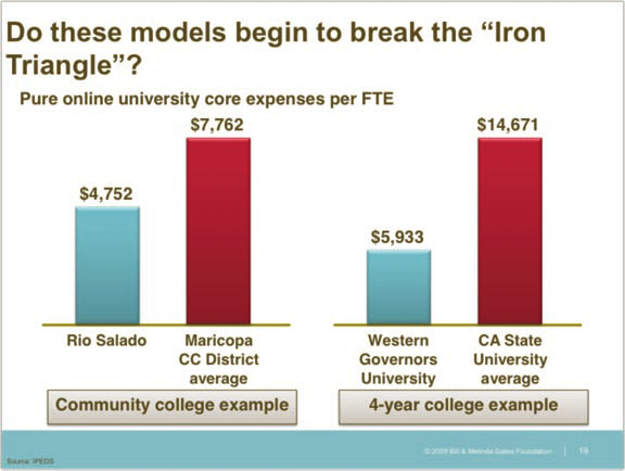 By stacking “pure online” college against real college, this chart insinuates that there is something about the online-ness of online education that makes it cheaper. A moment or two of actual thinking reveals this as nonsense. Technology in and of itself doesn’t make anything cheaper, in fact it adds hardware, software, and technical support costs. What makes Rio Salado and Western Governors University cheaper than Maricopa and Cal State is the fact that the online “universities” have dramatically reduced their faculty labor costs by hiring moonlighting real professors to prepare course materials (syllabi and reading lists that most of us make available on our websites for free) that are then “facilitated” by underqualified, low-wage, no-benefit “instructors” who are available “anytime, anywhere,” kind of like those people at the other end of phone sex lines. This may very well be stuff that people can learn something from, but it’s not a genuine university education. And the way that we know that for sure lies in the fact that neither the children of the corporate execs selling this stuff nor the children of the policy makers and legislators buying it will be getting their college degrees from the University of the People or iTunes U.