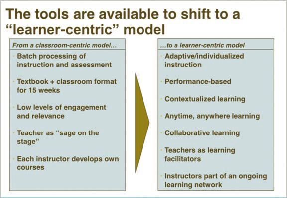 Listen to any advocate for on-line learning, elearning, ilearning, or hybrid learning and within two minutes you will inevitably hear something about how the world has changed and, no matter how hard it may be for those tweedy professors, we now have to embrace student-centered and “learner-centric” models. Only now, as Hewlett Packard and Microsoft and Apple have entered the education market, have we discovered that different people learn in different ways, and the days when a professor could just stand up and bray at his or her students are gone.