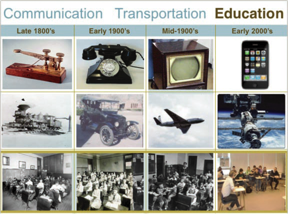 Were I a more technologically sophisticated blogger, you would see this slide in the suspense-building way that the Gates Foundation folks prepared it, with the telegraph-to-iphone strip leading off, followed by the miracle migration from the steam engine to the space station, and then topped off with the punch line of repetitive classroom photographs, where education has only recently managed to emerge from black and white and into a drab, 1960s-era Kodachrome color.